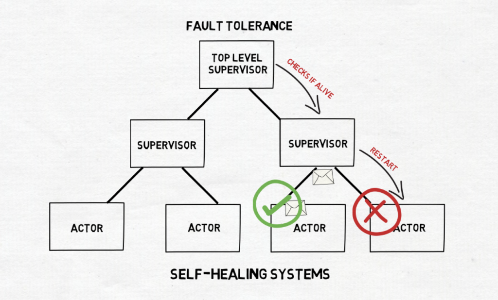 Actors organize hierarchically with parent-child relationships. Parents supervise children and respond to failures by choosing a strategy: resume, restart, stop permanently, or implement a custom approach.