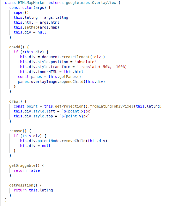 Custom HTML markers solve alignment and debugging issues with standard Google Maps markers. The implementation requires extending google.maps.OverlayView and defining three lifecycle methods: