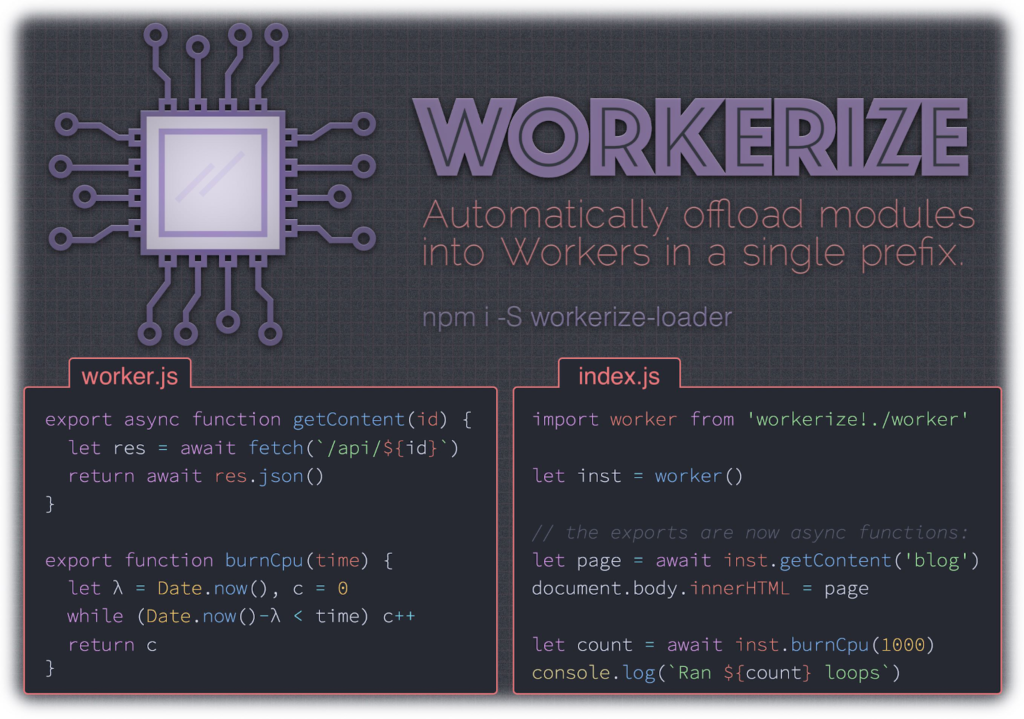 Workerize-loader enables offloading computationally intensive JavaScript tasks to background threads. It works out-of-the-box with create-react-app and supports TypeScript with declaration files.